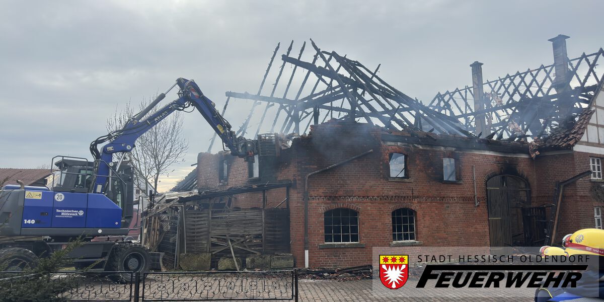 Zur Versorgung der Einsatzkräfte wurde der Versorgungsgruppe des Landkreises nachalarmiert.Im weiteren Verlauf rückte das THW mit einem Bagger an, um die Giebelwände sowie den Schornstein kontrolliert einzureißen. Dadurch konnten Gefahren reduziert und verbleibende Glutnester gezielt abgelöscht werden.